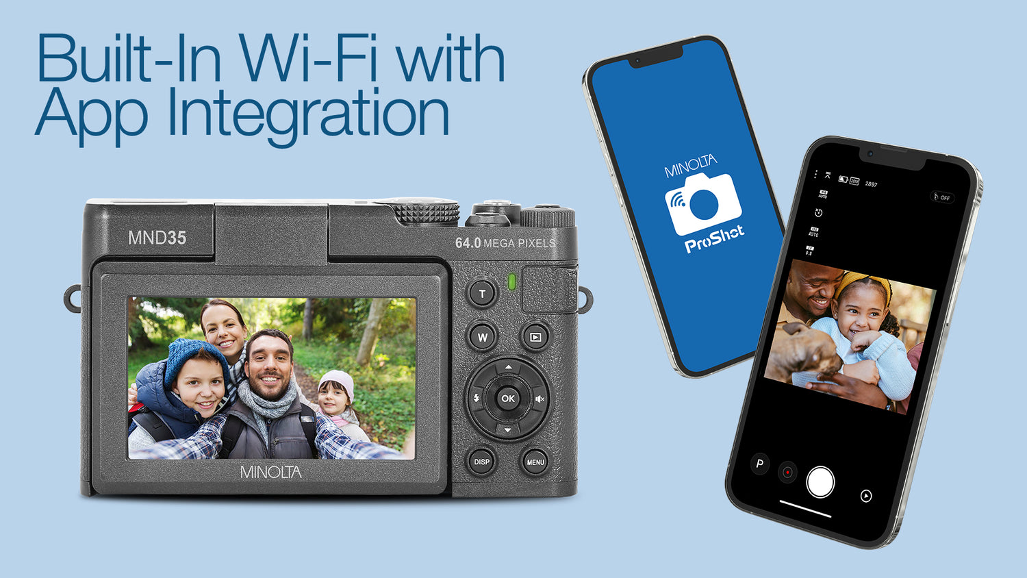 Control your camera and download photos and videos with the built-in WiFi and the Minolta ProShot app integration.